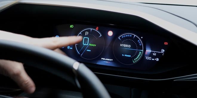 In alternativa Peugeot propone 4 configurazioni pre-installate e già, a mio modo di vedere, in grado di soddisfare le principali esigenze di ognuno. Gli elementi principali che compongono queste schermate sono quelli tipici dei quadri strumenti più comuni. Abbiamo quindi il quadrante del tachimetro, gli indicatori dell’autonomia (elettrica e a benzina), le indicazioni sulle percorrenze e quelle riguardanti la modalità di guida impostata. Ma non solo, il display dietro al volante può infatti anche mostrare una riproduzione della mappa del navigatore (funziona solo con il navigatore Tom Tom integrato) oppure uno schema del funzionamento del sistema di propulsione del veicolo.