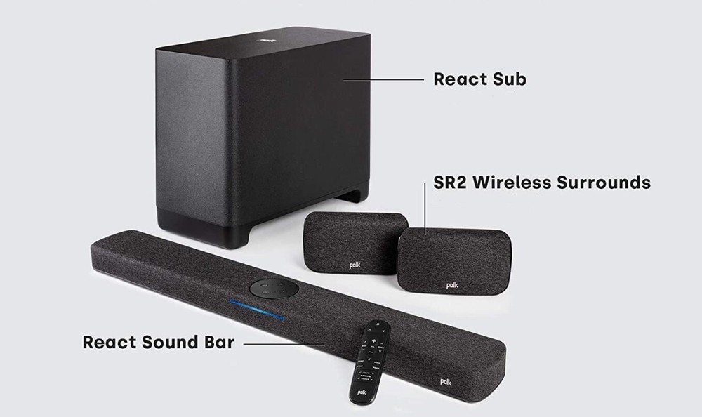 Polk Audio ha annunciato Polk React, un soundbar che parte da una configurazione canonica e che si può espandere con subwoofer e satelliti wireless per creare un vero sistema multi-canale. Il prodotto si presenta con un design semplice caratterizzato da bordi arrotondati. Sia il lato frontale sia quello superiore presentano una copertura in tessuto. Gli altri elementi immediatamente visibili sono una striscia a LED blu e una piccola zona circolare che ospita i pulsanti e i quattro microfoni “far-field” che gestiscono Alexa; le funzioni di assistente vocale sono quindi integrate nella soundbar.