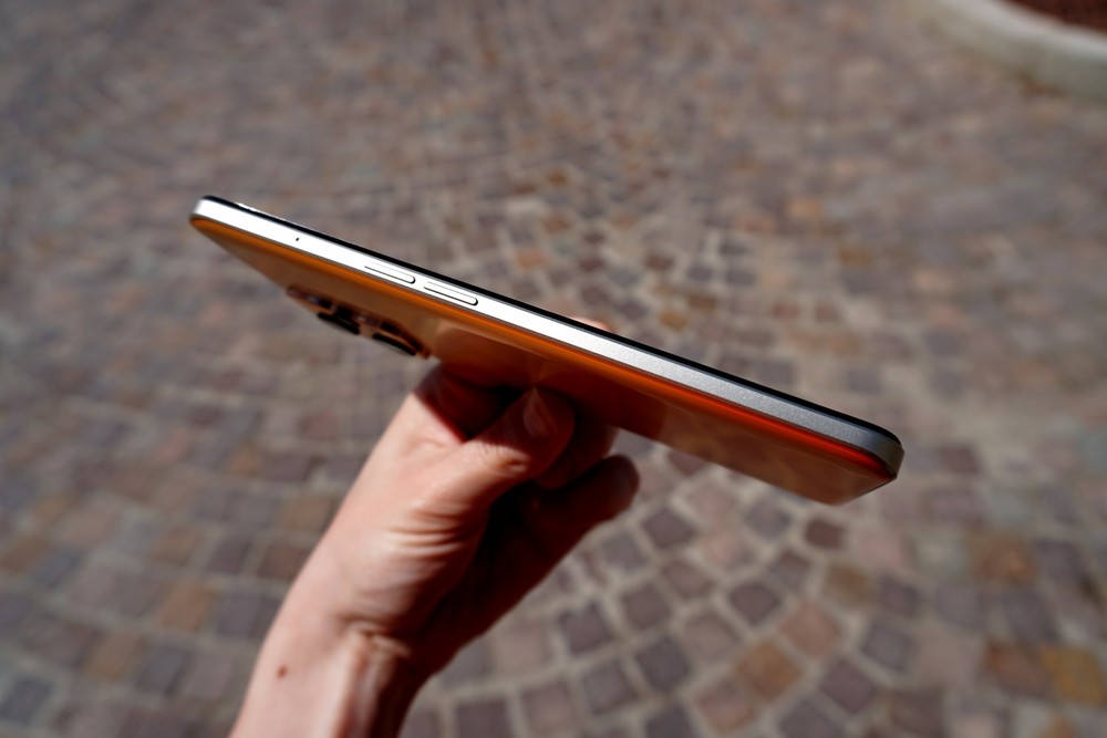 La cover posteriore è in materiale plastico, come anche la cornice a contrasto; la sensazione non è particolarmente premium, ma avendo una finitura opaca non trattiene troppo le impronte e ho apprezzato la scelta di posizionare il modulo fotografico su una placchetta trasparente in grado di dare continuità cromatica all’insieme.