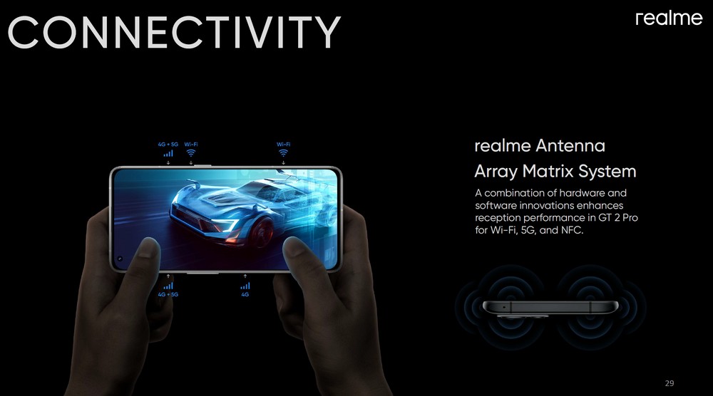 Oltre al processore e alla gestione termica, Realme ha fornito il GT 2 anche di altre soluzioni hardware e software, ad esempio la disposizione Array Matrix delle antenne telefoniche e WiFi, che consente di impugnare lo smartphone in landscape senza andare a coprire con parti della mano le antenne, pregiudicandone la ricezione.