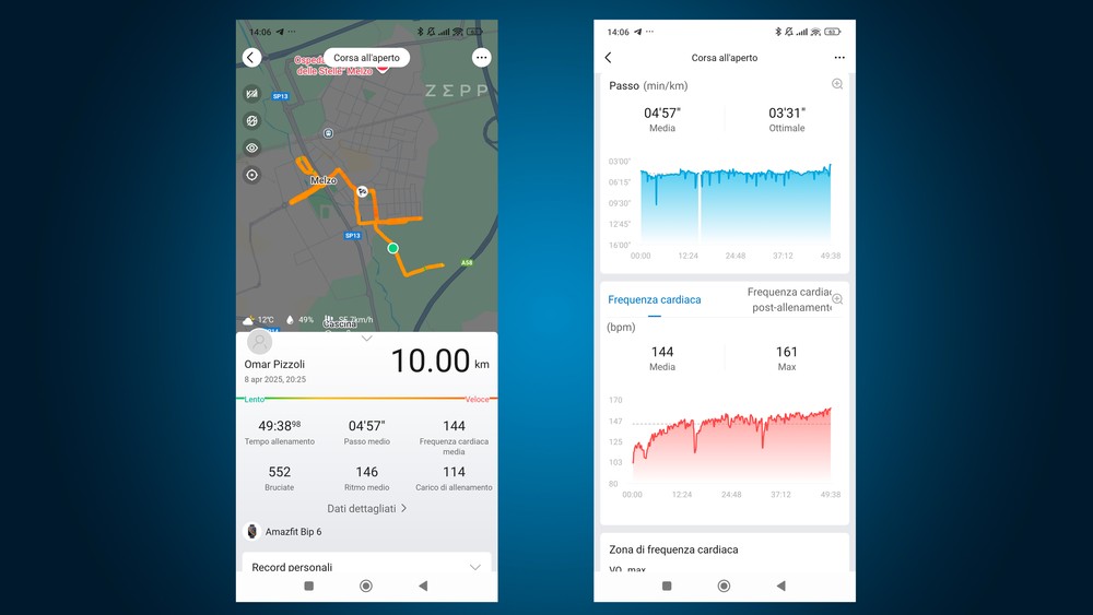 Il Bip 6 supporta oltre 140 attività sportive, con dati abbastanza accurati. Durante la corsa, ad esempio, sono disponibili metriche dettagliate come passo, frequenza cardiaca in tempo reale, media, distanza e altro ancora.