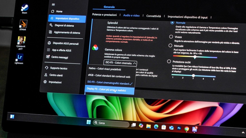 I display OLED sono ormai diventati uno dei punti di forza e dei tratti distintivi dei notebook Asus, quindi non sorprende affatto che il pannello all’interno dell’elegante guscio in alluminio del PZ13 sia proprio un OLED da 13.3 pollici, e anche di ottima qualità. Osservare qualsiasi tipo di contenuto su questo pannello non può che lasciare tutti soddisfatti sotto ogni punto di vista, dalla resa dei colori alla profondità dei neri e alla conseguente tridimensionalità delle immagini. L’unico difetto, se così possiamo considerarlo, è dato dalla luminanza massima tipica, che è leggermente inferiore ai 400 nit. Non il massimo se dovete utilizzare il notebook in esterna sotto la luce diretta del sole. In tutti gli altri casi il display fa il suo lavoro nel migliore dei modi, ma considerato il target, ovvero creativi in mobilità, il fatto che si possa avere qualche problema in esterna non è da sottovalutare.