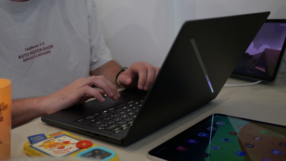 Rimane come sulla precedente generazione la scocca in alluminio CNC, gradevole al tatto e pratico per la dissipazione termica. Durante un utilizzo di Chrome con circa 8-9 schede aperte, Premiere Pro in standby, profilo Turbo su G-Helper e la scrittura di tre articoli (questo, quello dell’OPPO Watch X2 e quello della Smart Band 10) ho avvertito costantemente il tiepido della zona inferiore alla tastiera dove poggiamo i polsi ma non è un calore da irritare, da dare fastidio.
