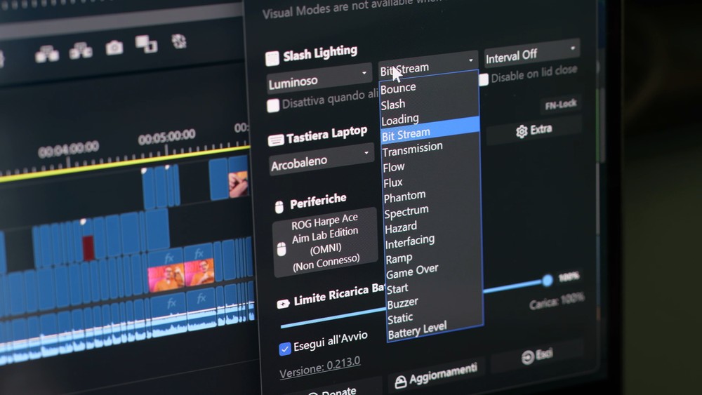Sul coperchio dello Zephyrus G14, dietro al display, ci sono svariati led bianchi posti in diagonale che formano la “Slash Lightning”, questa linea luminosa che possiamo configurare in svariati modi o spegnere del tutto. Risulta essere una soluzione piuttosto sobria, presente anche sulla precedente generazione. Io, ad esempio, la utilizzo per notificare agli altri in redazione a che livello è la mia batteria, facendo spegnere “le tacchette” in base alla percentuale di batteria residua. Una soluzione carina, non stravolgente ma utile!