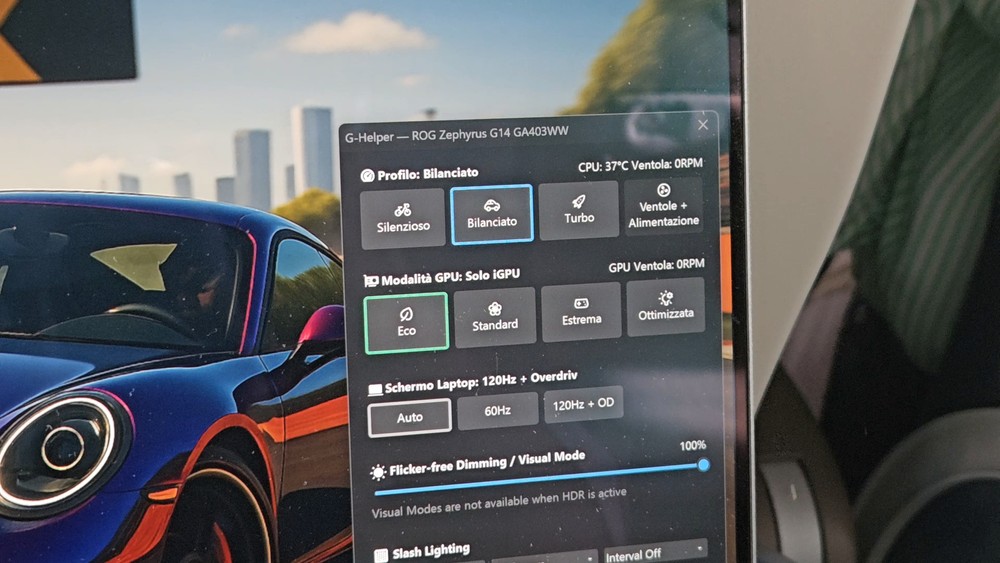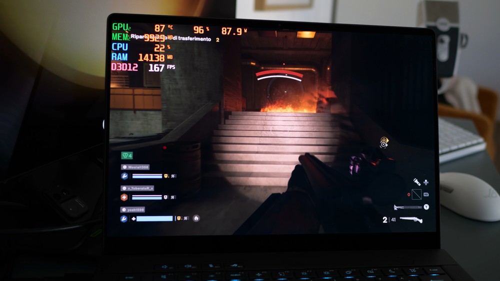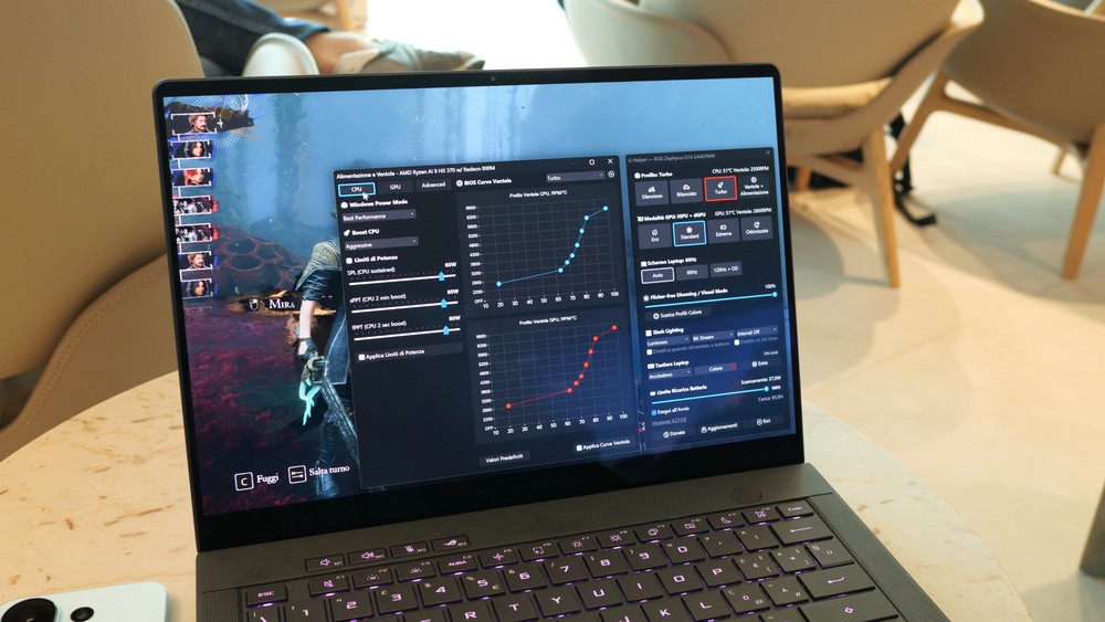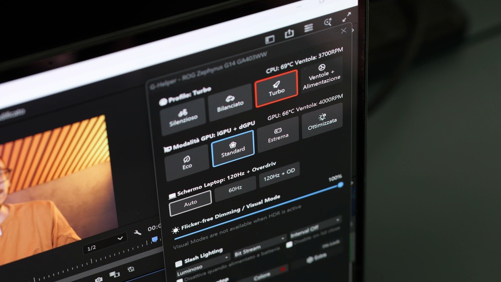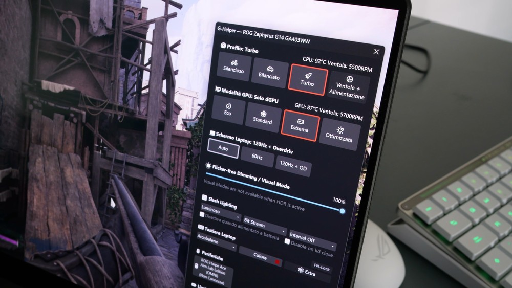 Parlando di gaming nudo e crudo, tramite G-Helper ho forzato la modalità Turbo ed “Estrema”, che in breve significa utilizzare soltanto la dGPU per evitare che qualche app sfrutti invece la iGPU. Ho anche impostato le ventole al massimo, così da non aver alcun dubbio sulla dissipazione. Siamo in piena estate ed è inevitabile avere temperature leggermente più proibitive, durante una sessione di gaming non reputo un problema avere le ventole un po’ più rumorose dal momento che comunque il tutto viene sovrastato dal volume di gioco.