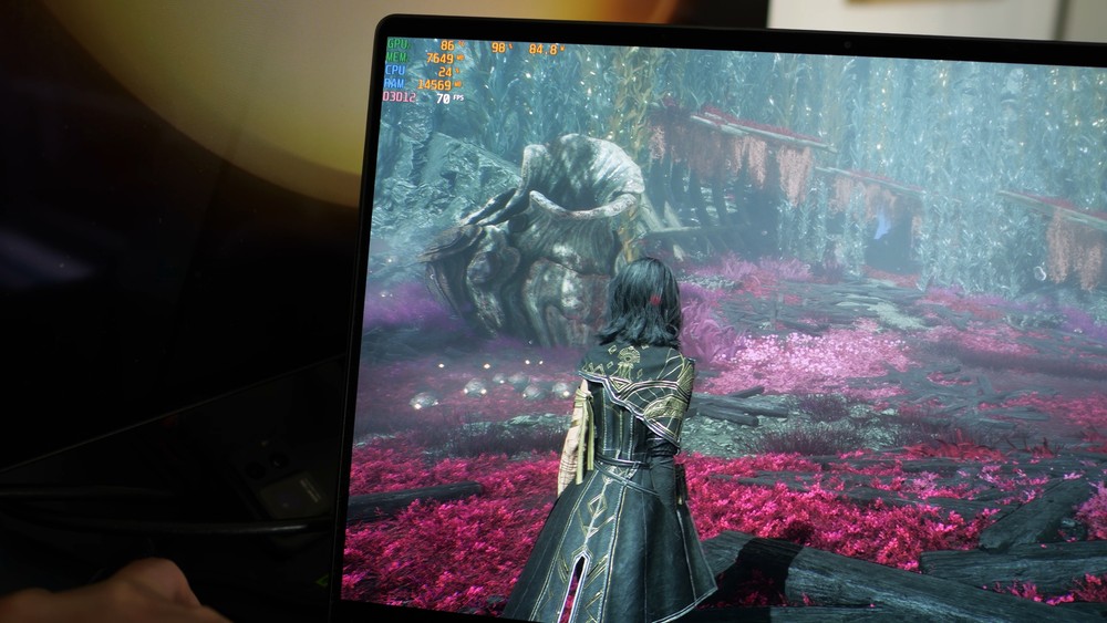 Con Avowed l’esperienza è ancor migliore: qui ho sfruttato il DLSS 3 e l’Upscaler in “Auto”. Ho lasciato sempre la risoluzione nativa e tutte le impostazioni grafiche al massimo. Quello che abbiamo ottenuto è un framerate dagli 80 ai 100 fps, un consumo della CPU attorno al 30-40%, la RAM occupata di 25GB ed una GPU dagli 80 ai 100W con GPU attorno agli 87°C e CPU attorno ai 93°C.