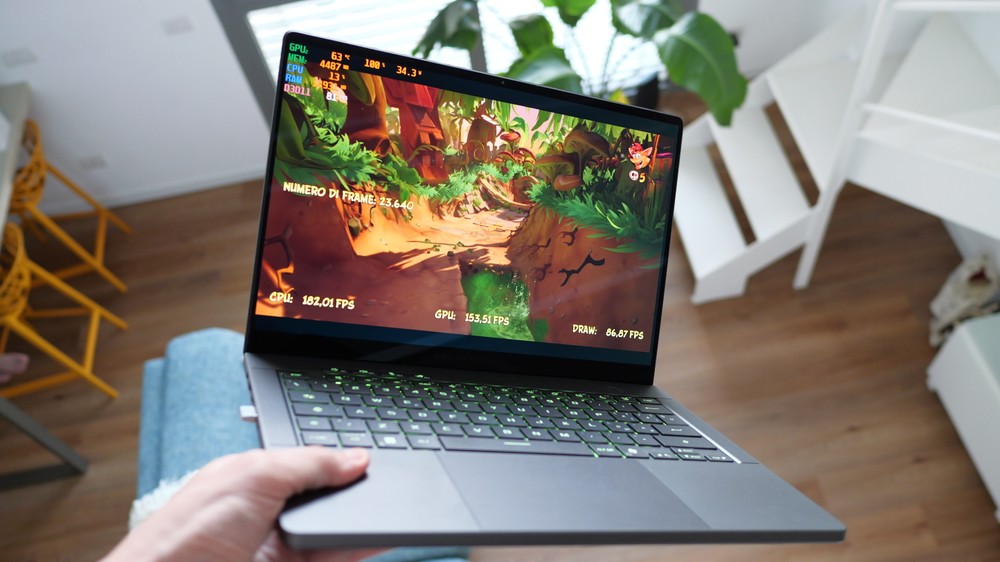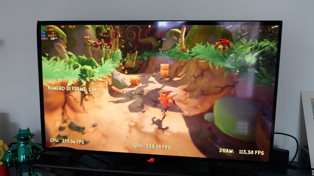 Con Crash Bandicoot 4 ho invece optato per due test: quello sotto carica e quello a batteria. Rispetto agli altri titoli citati questo è molto più leggero e difatti al massimo dei dettagli, DLSS attivo e risoluzione nativa, in questo caso del monitor WOLED ROG esterno, ho raggiunto picchi di 120-140fps mentre la media era attorno ai 100fps.