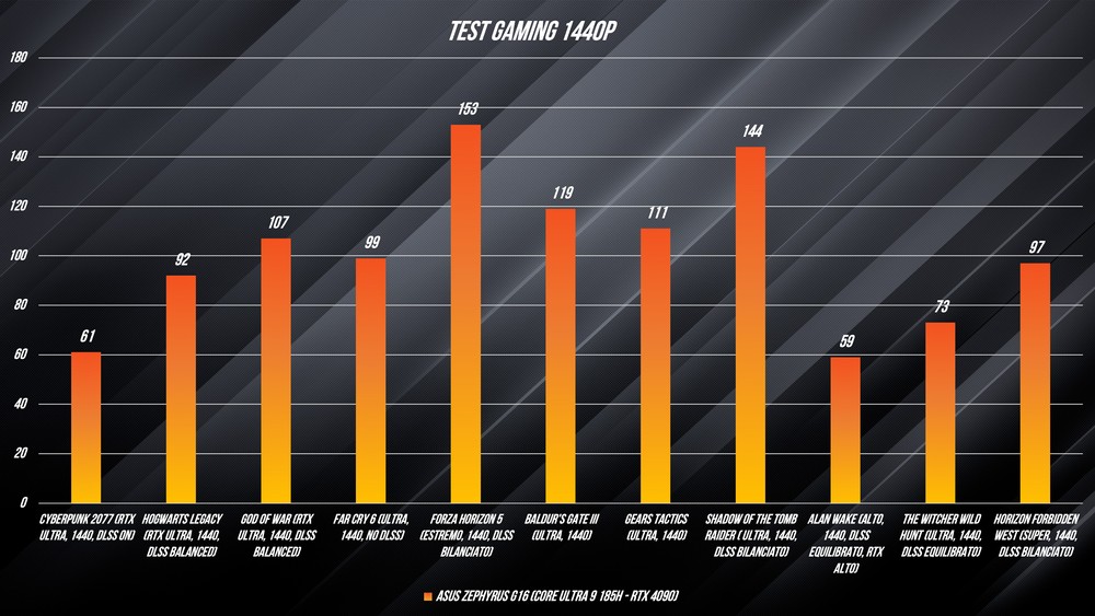 Al di la del suo aspetto però, questo è e rimane un notebook da gaming e quindi non possiamo non analizzare il suo comportamento in questo ambito. Come già anticipato ho provato le sue prestazioni con 10 titoli abbastanza recenti e tutti discretamente dispendiosi in termini di risorse richieste. I risultati? Ovviamente molto buoni, anche se non siamo ai livelli dei portatili che riescono a sfruttare al massimo la 4090, ma che sono anche caratterizzati da uno spessore e da un peso decisamente superiori. Sfruttando le tecnologie di super sampling, in questo caso il DLSS 3 di NVIDIA, si riescono a ottenere e superare i 60 fps in 1440 in praticamente ogni titolo provato.