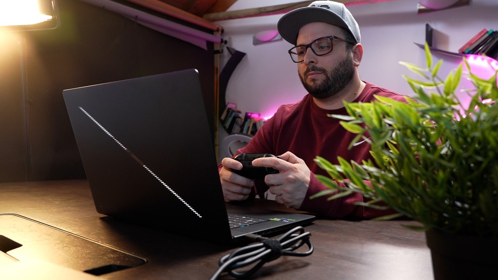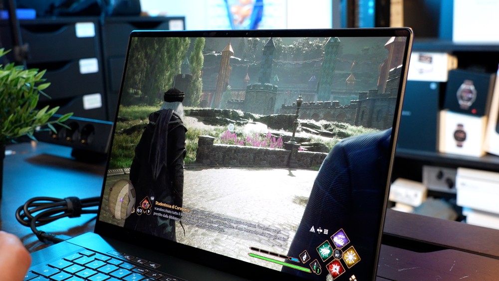 Insomma anche con qualche compromesso dovuto alle dimensioni ci si può giocare davvero con soddisfazione, specialmente se si è alla ricerca di una soluzione appagante anche dal punto di vista estetico. E parliamo di un notebook che si presta molto bene anche per un utilizzo più legato alla produzione di contenuti. Montaggio, video e fotoritocco, anche a livelli medio-alti, sono assolutamente supportati nel migliore dei modi, con il vantaggio offerto dalle soluzioni NVIDIA in termini di potenza di calcolo legata alle funzioni AI, ormai strumenti sempre più diffusi e in grado di fare la differenza in molto situazioni.