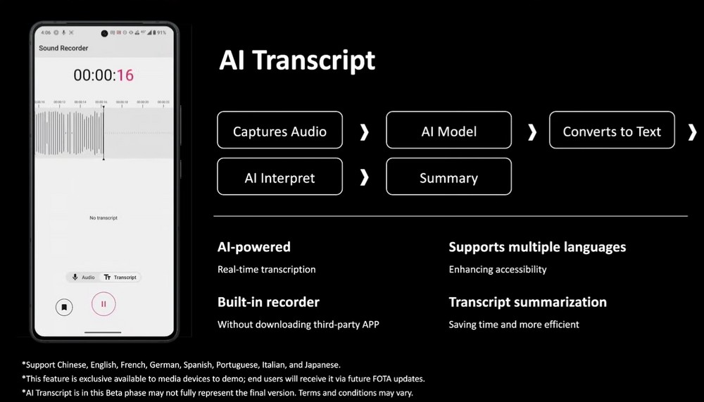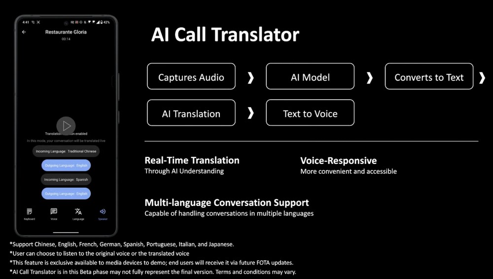 Carina anche la funzionalità AI di trascrizione – tralasciando il fatto che di AI forse si parla un po’ a sproposito visto che si tratta di funzionalità che non devono scomodare AI vere per funzionare – che permette di avere conversazioni con un’altra persona in lingue diverse con un tempo di attesa non troppo lungo tra parlato e traduzione.
