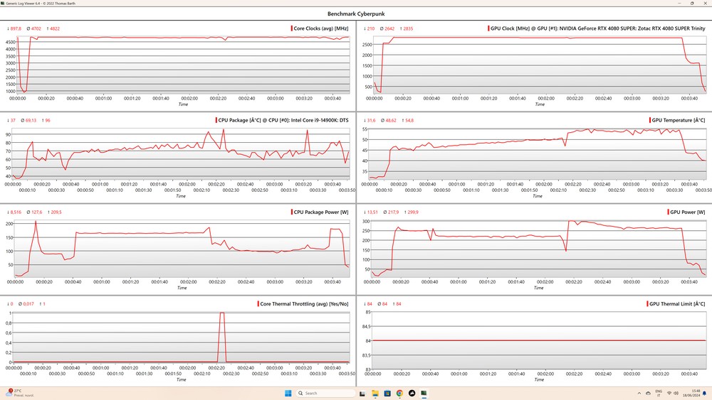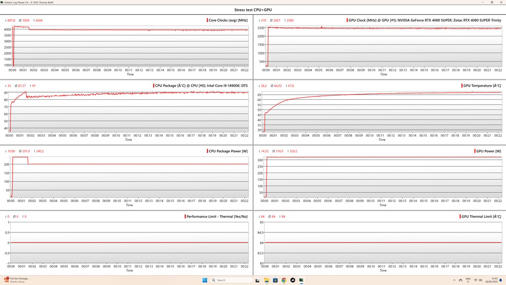 Nel complesso abbiamo testato una decina di giochi: gli otto i cui benchmark vedete poco sopra e poi, a fine di puro gioco/esplorazione, Starfield e The Witcher 3. L’unico titolo in cui non abbiamo osservato throttling è stato Metro Exodus, per chissà quale ragione. Il fatto curioso è che durante gli stress test, in cui CPU e GPU girano al 100% del carico per periodi di tempo prolungati, i risultati sono stati altalenanti: ogni tanto ci sono stati throttling, ogni tanto no, per poi attestarsi su temperature tra gli 80 e i 90°C. In tutti i casi, tra un test e l’altro abbiamo lasciato scendere il liquido di raffreddamento al di sotto dei 30°C rilevati; la temperatura ambientale ha oscillato tra i 20 e i 22°C.