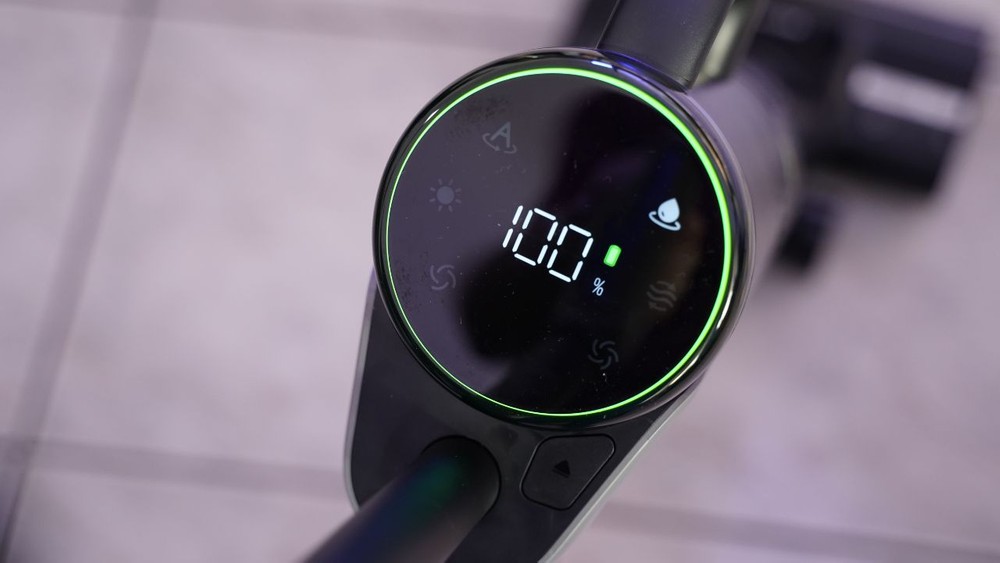 Il display di tipo LCD nella parte alta permette di tenere sotto controllo tutte le funzioni dell’elettrodomestico. Nella parte centrale viene visualizzata la percentuale di batteria residua, e ci sono poi sei icone. Due indicano le modalità utilizzabili durante la funzione di lavapavimenti, le altre due le modalità per l’aspirapolvere senza fili e infine altre due che indicano le fasi di lavaggio e asciugatura del rullo quando la lavapavimenti è sulla base di ricarica e lavaggio. Infine un anello circolare si illumina dal verde al rosso quando si usa la H12 Dual come lavapavimenti per indicare il riconoscimento automatico dello sporco che gestisce potenza e flusso d’acqua in maniera variabile.