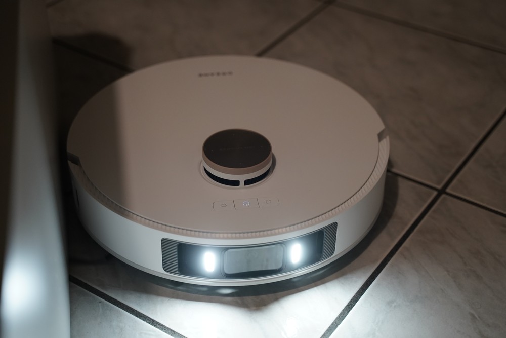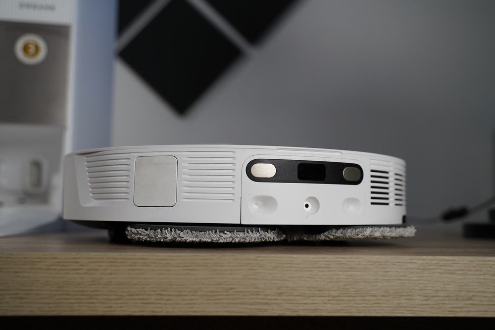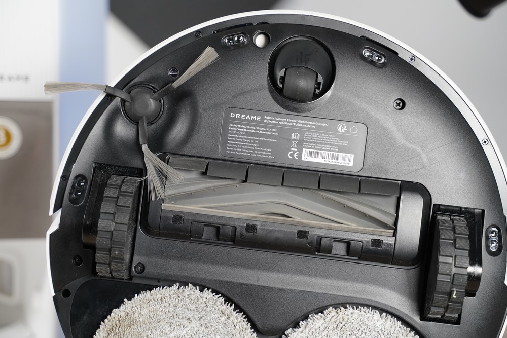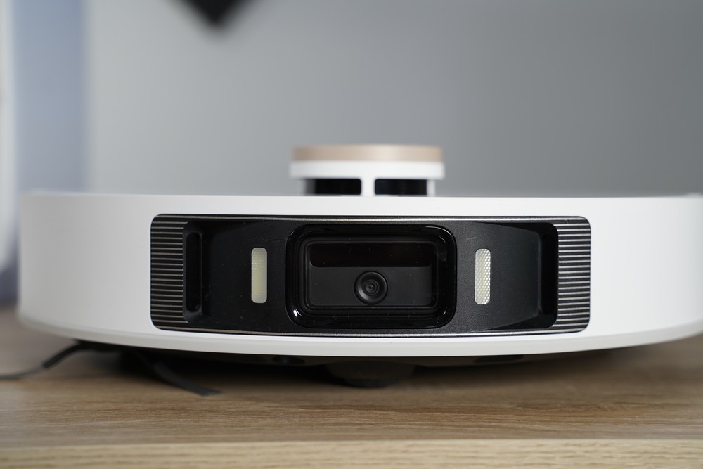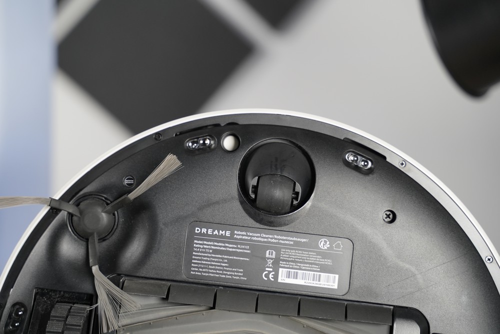 Nella parte frontale ci sono sensori e videocamera che permettono di rilevare piccoli oggetti ma anche di utilizzare le funzioni di videosorveglianza. Nessun problema per l’uso in ambienti bui. Due potenti LED si illuminano in maniera automatica se necessario. Nella parte inferiore troviamo sei sensori anticaduta, una spazzolina laterale, la nuova spazzola principale in silicone e il sensore per i tappeti, oltre ai due moci controrotanti. Quello destro è montato su un braccetto che permette di spostarlo lungo il bordo in modo da non lasciare spazi scoperti durante la pulizia.