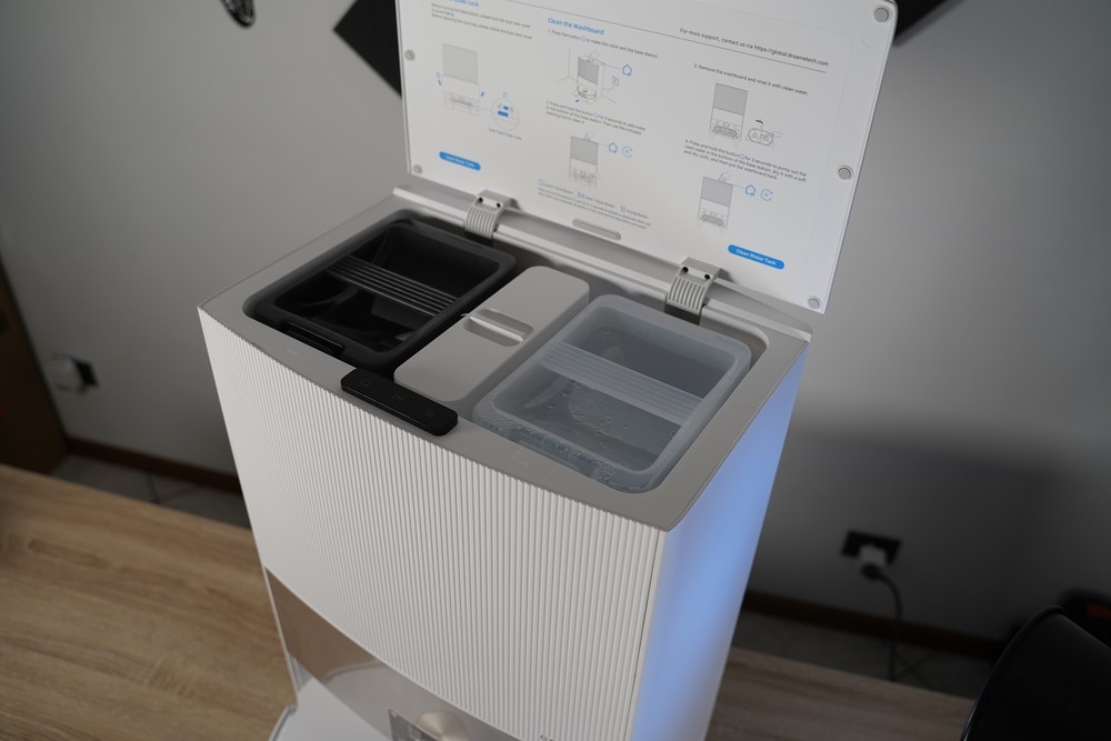Dalle dimensioni importanti e con un design più squadrato rispetto a quella di DreameBot L10S Ultra, la nuova base per il lavaggio e lo svuotamento automatico è a nostro parere più bella e meglio costruita. Il robot si posiziona tramite un piccolo scivolo. Nella parte frontale è presente un pannello rimovibile tramite apposito tasto che nasconde il sacchetto per la raccolta della polvere mentre nella parte alta un ulteriore vano nasconde i due serbatoi per l’acqua pulita e la raccolta dell’acqua sporca. Viene incluso anche un accessorio per la manutenzione e la pulizia del robot, oltre a tre tasti che consentono di avviare la pulizia, rimuovere o far ritornare il robot alla base e avviare la pulizia e asciugatura dei panni.