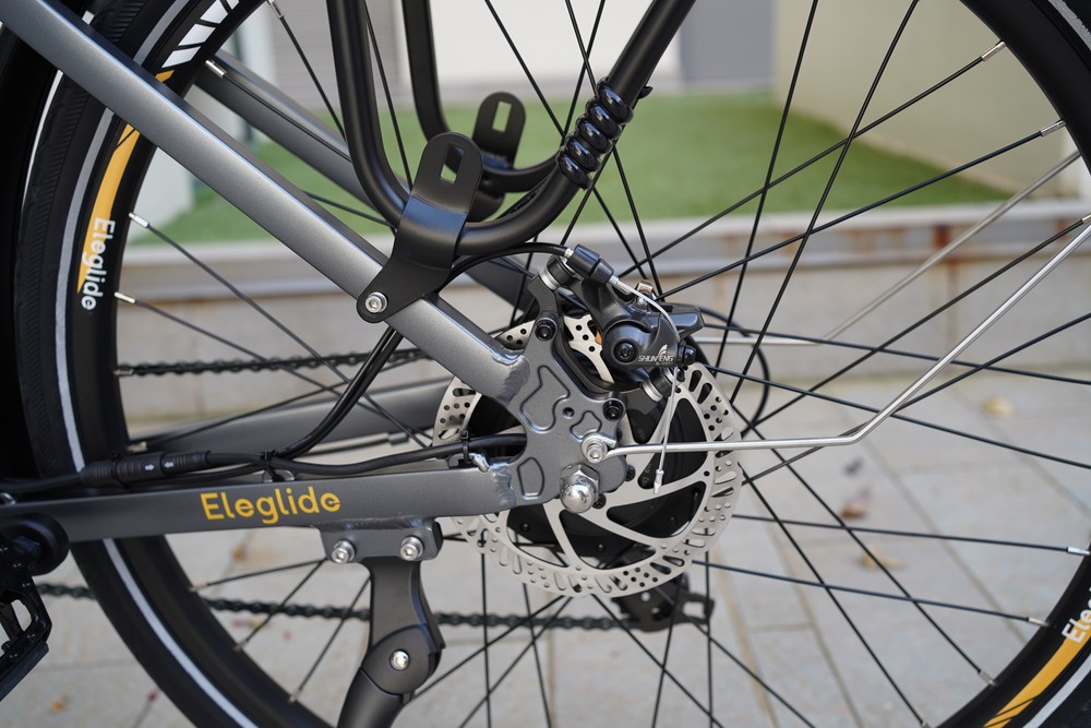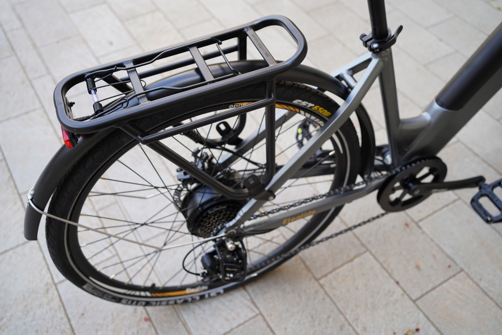 Il telaio è ben assemblato, robusto anche se ovviamente non parliamo di una eBike realizzata per uso sportivo, per fare discese sterrata a 50km/h o ancora per saltare o affrontare gite nel bosco. Sebbene la forcella anteriore permetta di attutire buche e tombini, questa Eleglade T1 è pensate per utilizzo su asfalto, piste ciclabili e sterrato molto leggero. Se infatti il telaio regge fino a 120KG e il portapacchi consente di tenere piccoli pacchetti, i copertoni e le ruote in generale, non sono rinforzati.