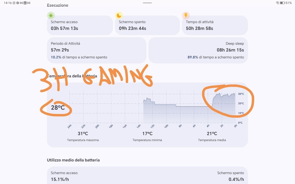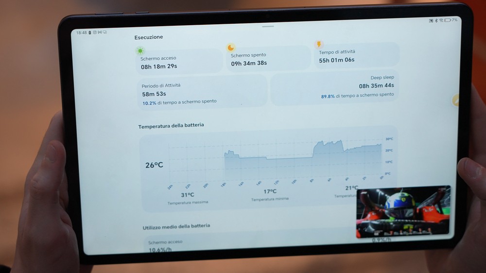 L’autonomia è eccellente. Ho raggiunto più di 8h20min di display attivo in una giornata dove ho videogiocato per circa tre ore e per il restante tempo ho tenuto il tablet a visualizzare tutti gli eventi di Formula 1 e Formula 2 in streaming. Con tre ore di videogioco pesante, come Honkai Star Rail, si consuma circa il 40% di autonomia. Insomma gli 8300mAh di batteria all’interno di questo tablet permettono una giornata e mezzo di uso intenso ma anche una settimana piena di uso randomico. La ricarica ferma a 35W è rapida ma non rapidissima. Bene anche le temperature batteria: nella giornata stress raccontata sopra ho raggiunto una massima di 31°C, una minima di 17°c ed una media complessiva di 21°c nell’arco di 24h.