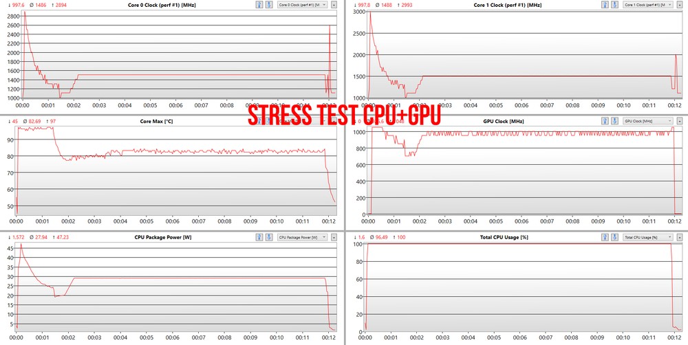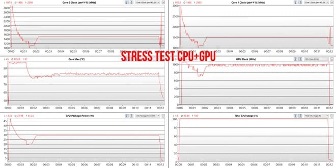 Nelle situazioni in cui non è richiesto l’intervento della componente grafica, poi, si ha un incremento della frequenza della CPU che consente di mantenere i 2,5 GHz su tutti i core per un periodo di tempo molto prolungato. Le temperature si stabilizzano poi intorno ai 95 gradi, a testimonianza di una messa a punto molto spinta e ben ottimizzata. Non vi fate comunque spaventare, all’esterno la scocca non va mai oltre i 40-42 gradi nella parte inferiore e non si superano i 37 nella zona più calda della tastiera.