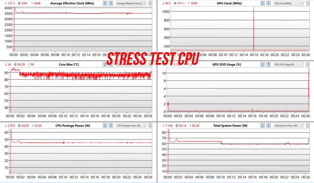 Come sempre ho svolto i nostri stress test che coinvolgono inizialmente solo la CPU e poi CPU e GPU in contemporanea. In entrambi i casi notiamo come Huawei abbia optato per una messa a punto abbastanza spinta, che mantiene temperature abbastanza elevate dentro la scocca pur di avere una frequenza operativa discretamente elevata su tutti i core per molto tempo. In particolare il test che coinvolge la CPU mostra una frequenza media di quasi 3.5GHz, con temperature che arrivano a toccare i 96 gradi per poi stabilizzarsi e ottenere una media di quasi 86 gradi per tutta la mezz’ora del test. Fuori dalla scocca le temperature restano comunque accettabili, con il picco massimo che si registra nella parte inferiore, dove abbiamo la griglia di areazione. Qui si sfiorano i 41 gradi, mentre sulla tastiera non andiamo mai oltre i 35-36. Durante questo test il consumo medio registrato è di circa 60W per l’interno sistema.