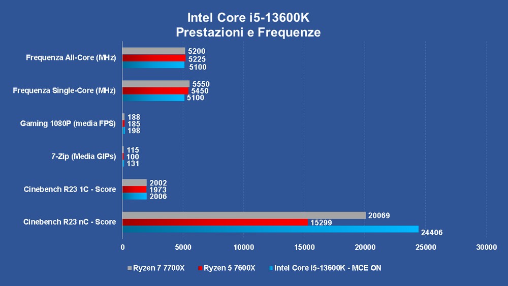 In questa tornata di test AMD rimane avvantaggiata su WinRar e Mozilla Kraken, mentre se parliamo di gaming il “piccolo” Raptor Lake registra in media un +7% su Ryzen 5 7600X e +5,3% su Ryzen 7 7700X (FPS medi a 1080P precisiamo). Tornando invece al confronto in casa con Alder Lake, questo Core i5 batte sempre il 12600K e il 12700X, senza contare che spesso siamo vicino a un Core i9-12900K e a volte addirittura davanti, anche nei giochi seppur in misura variabile.