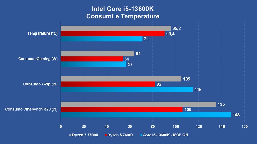 Il Core i5 consumo poco più del Ryzen 5 7600X in gaming, più in linea con Ryzen 7 7700X, mentre fa registrare sia i consumi di picco più alti che le temperature di esercizio più contenute, il tutto con prestazioni multi-core – che ora vedremo nel dettaglio – decisamente superiori.
