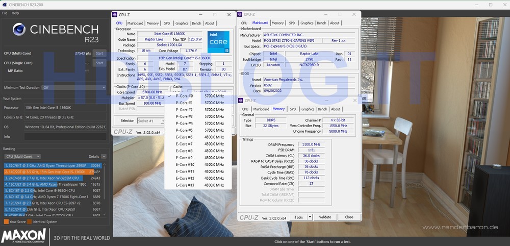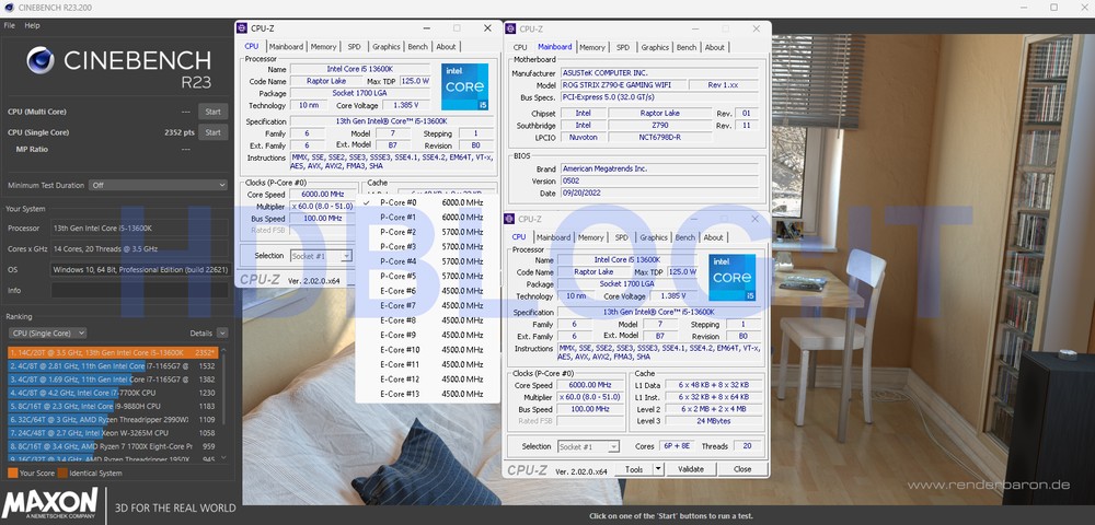 Viste le schede madri ASUS, non è difficile intuire quale sarà la piattaforma di test per il Core i9-13600K, raffreddato in questo caso da un altro prodotto targato ASUS, il ROG RYUJIN II 360. Per misurare le prestazioni del chip Intel abbiamo utilizzato un kit DDR5 6200 e un kit DDR4 4000, in modo da riprodurre uno scenario omogeneo e non troppo a sfavore delle DDR4. Tra le altre cose, il memory controller di Raptor Lake-S si è dimostrato a dir poco ottimo in quanto per la prima volta ci ha permesso di utilizzare le DDR4 in modalità Gear 1, ossia con memory-controller a 2.000 MHz (con Alder Lake-S c’era un muro a circa 1.800 MHz). Per l’occasione abbiamo anche rivisto i benchmark per i “vecchi” Alder Lake-S, “livellando” tutte le piattaforme DDR5 – quindi anche Raptor Lake e Zen4 – con DDR5 6200.