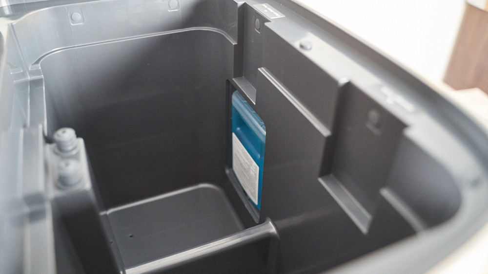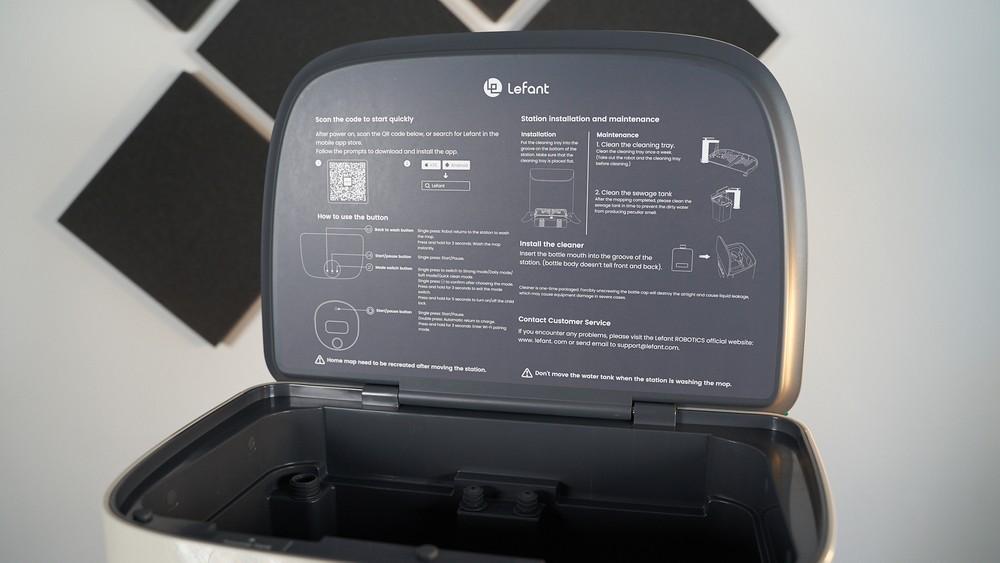 All’interno ci sono due serbatoi da cinque litri ciascuno, uno per l’acqua pulita e l’altro per la raccolta dell’acqua sporca oltre a un piccolo incavo in cui inserire il flacone di detergente incluso nella confezione da 371 grammi, che dovrebbe permettere circa 975 lavaggi. La stazione consente di lavare i panni in maniera completamente automatica e di asciugarli tramite un flusso d’aria di circa 40°C per evitare la formazione di cattivi odori. L’alloggiamento del robot è realizzato in plastica trasparente e può essere facilmente rimosso per le operazioni di manutenzione.