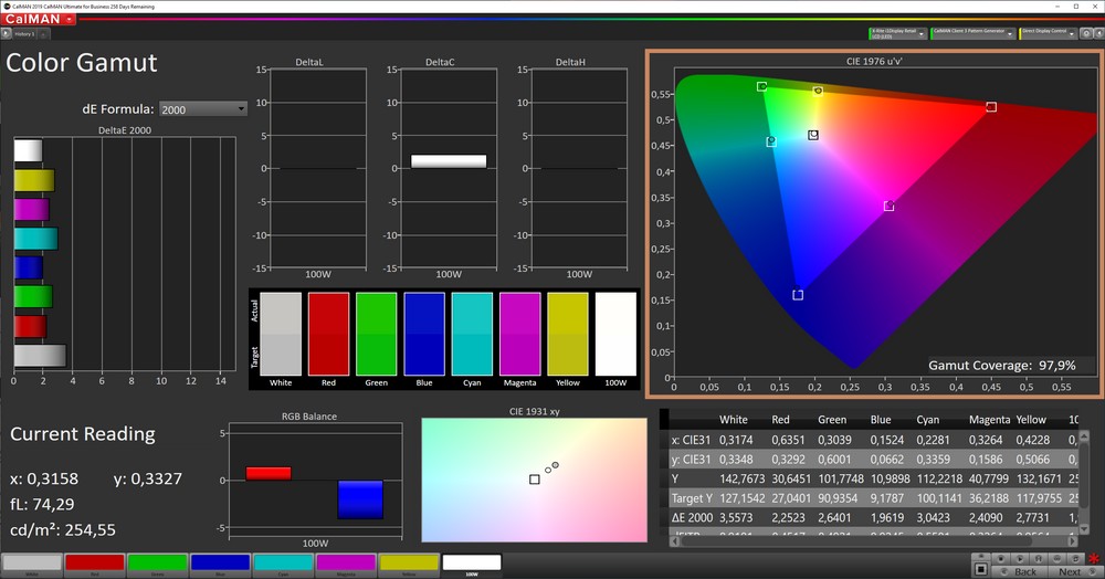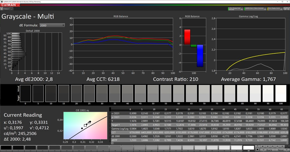 Ad impressionare è però soprattutto la precisione nella riproduzione dei colori. I Delta E medi sono infatti molto bassi sia per la scala di grigi che per i colori. Nel dettaglio parliamo di un valore di 2,8 per i grigi e 1,8 per i colori, entrambi sotto la tolleranza e con un errore massimo pari a 3,82 comunque molto vicino alla soglia.