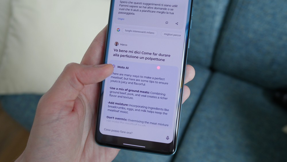 Anche a Moto AI possiamo richiedere informazioni, come “posso usare l’uovo per dorare il polpettone” e la risposta sarà molto simile a quella di Gemini, dal momento che hanno lo stesso “motore”, ma Moto AI è molto più riassuntiva ed essenziale dove Gemini si allunga spesso in spiegoni da 1-2 minuti di lettura o ascolto.