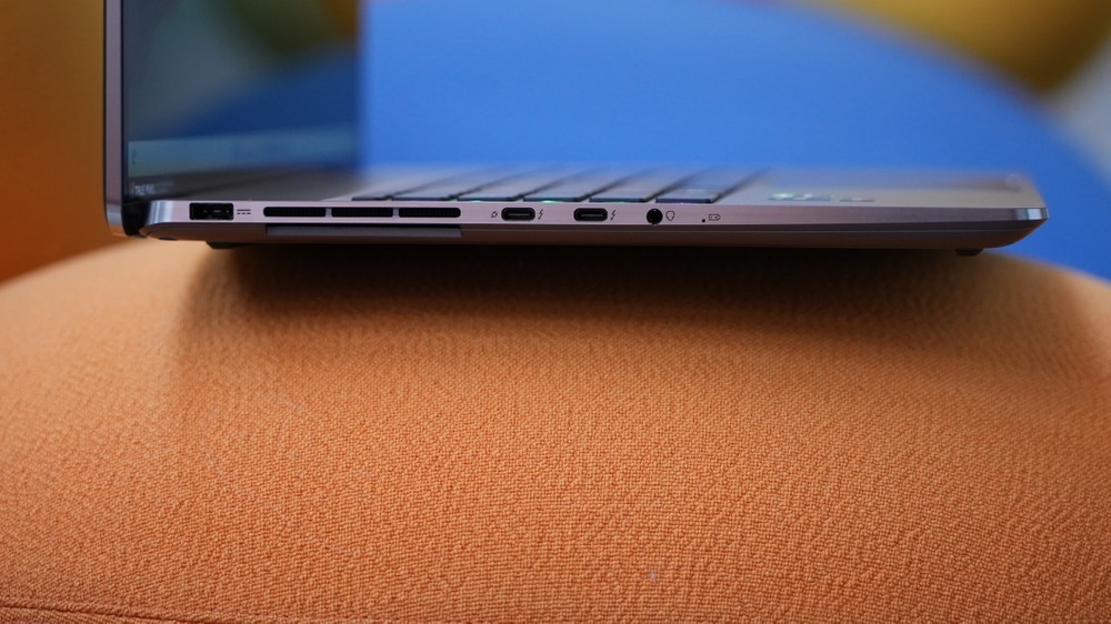 Anche la dotazione di porte è assolutamente sufficiente. Sul lato destro abbiamo una USB-A, una HDMI 2.1 in formato standard e un lettore di schede SD, mentre a sinistra trovano posto due USB-C (entrambe con supporto Thunderbolt 4), il jack audio da 3,5 mm e il connettore proprietario per l’alimentatore. Insomma, non manca praticamente nulla, l’unica cosa che forse avrei aggiunto è una porta ethernet, ma si può rimediare con un adattatore da pochi euro.