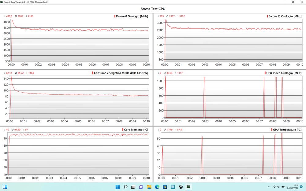 Partiamo dal test con il quale carichiamo al 100% la sola CPU. Come possiamo vedere, dopo un picco iniziale nel quale si superano i 4 GHz, la frequenza dei Performance Core si attesta intorno ai 3,5 Gz. Allo stesso modo gli Efficency Core partono oltre i 3 GHz per poi ottenere una media di circa 2,5 GHz. Le temperature all’interno della scocca sono ovviamente molto alte, arrivano a toccare i 97 gradi con una media di 94 ma allo stesso tempo abbiamo un TDP decisamente elevato; si parte con addirittura 146 W di picco per poi avere una media di circa 85 alla fine del test. Insomma, sono numeri che letti così possono aver poco senso ma che mostrano un andamento comunque confortante e che si traduce in prestazioni ottime in tutte le situazioni in cui è coinvolta la sola CPU. Il leggero throttling che si crea non è così impattante, tanto che comunque, anche a pieno carico, il sistema resta abbastanza reattivo e fluido.