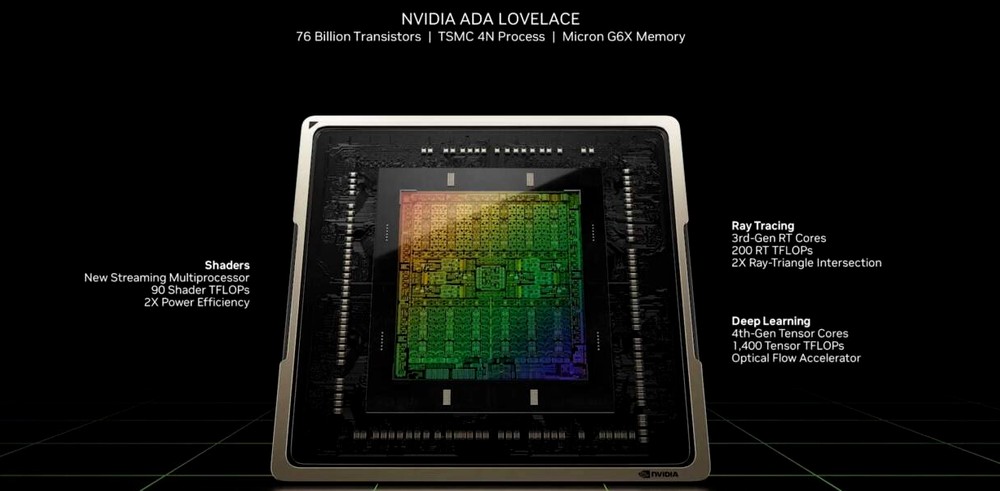 Iniziamo dalle basi. Le GPU Ada Lovelace possono contare su un nuovo Streaming Multiprocessor che, oltre ad essere decisamente più potente rispetto a quello di Ampere – si parla di un picco di 90 TFLOPS – risulta anche il doppio più efficiente. Questo però è solo l’inizio: a bordo troviamo anche i Tensor Core di Quarta Generazione per i calcoli AI con prestazioni sino a 1,3 TFLOPS (su RTX 4090) e gli RT Core di Terza Generazione che, grazie a diverse novità e ottimizzazioni, permettono di doppiare le prestazioni ray-tracing (pure) della precedente generazione, soprattutto nelle scene più complesse.