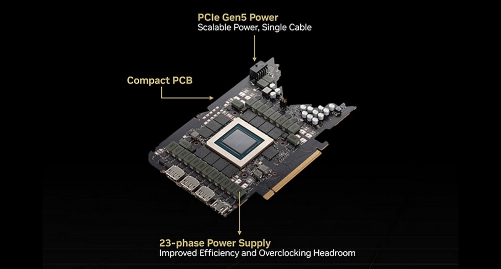Riguardo l’estetica, la serie RTX 4000 non cambia direzione rispetto alle RTX 3000; questa GeForce RTX 4090 riprende il design Dual-Axial Flow-Through con doppia ventola, ulteriormente migliorato e a dir poco mastodontico (come del resto si vede in foto). Le ventole sono più grandi per garantire temperature di esercizio nella norma, mentre se invece guardiamo al PCB non notiamo particolari stravolgimenti rispetto alla vecchia generazione.