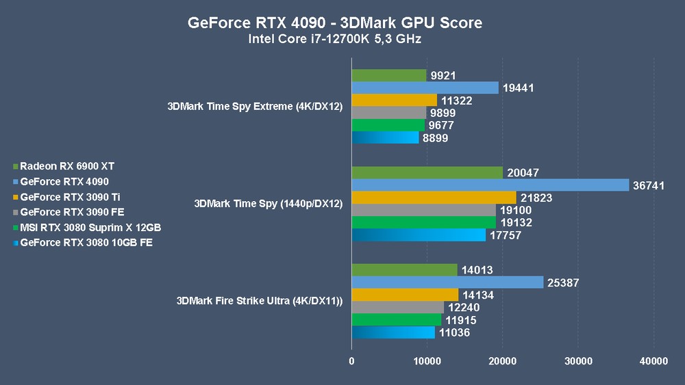 Ribadendo che si aspettano anche driver ulteriormente ottimizzati e patch per i vari titoli, notiamo subito la marcia in più della RTX 4090 già sul test sintetico del 3DMark dove, prendendo come riferimento il pesante Time Spy Extreme (4K), la nuova GPU Ada Lovelace stacca la più potente Ampere – RTX 3090 Ti – quasi del 72%. In media registriamo un aumento del framerate in 4K del 54,4%, media in realtà “rovinata” da Far Cry 6 che vede la GeForce RTX 4090 davanti solo del 26,8%.