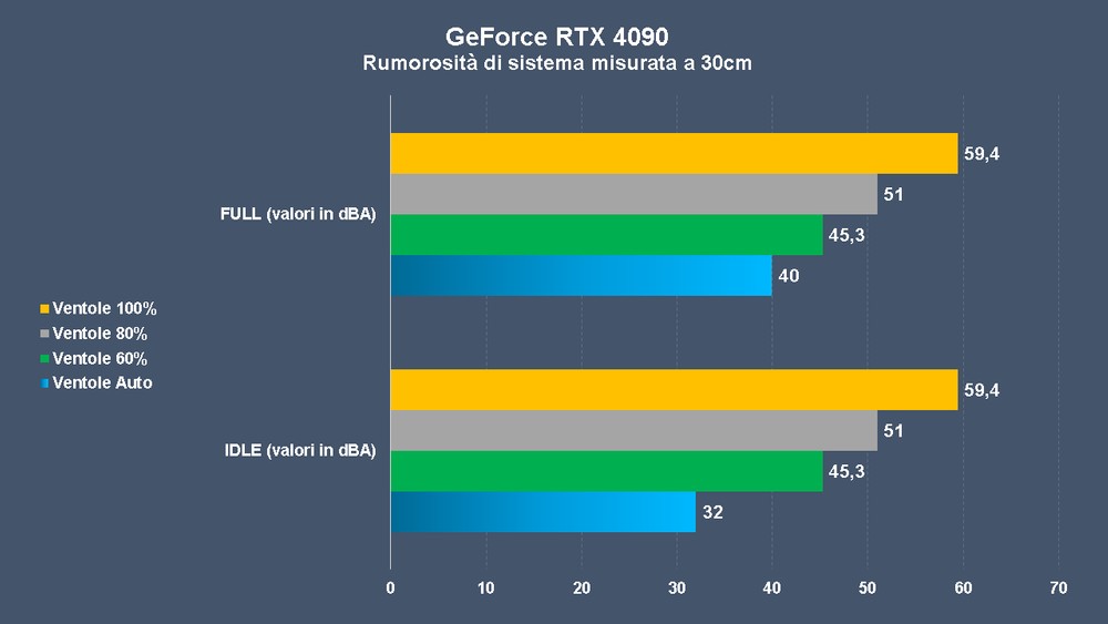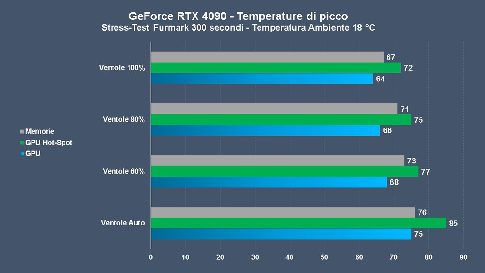 Anche con ventole gestite in automatico, la NVIDIA GeForce RTX 4090 non ha superato mai i 76 °C (hot spot 85 °C in realtà), permettendo di creare un profilo personalizzato con un ottimo compromesso tra temperature e rumore prodotto; inutile dire che le due ventole al 100% – oltre i 3000 RPM – sono invece molto rumorose, garantendo però di abbattere le temperature sino a 67 °C sotto FurMark (che è ottimo); anche le memorie si sono comportate bene, merito delle GDDR6X Micron da 2GB che permettono di usare meno chip e, cosa più importante, su un singolo lato del PCB.
