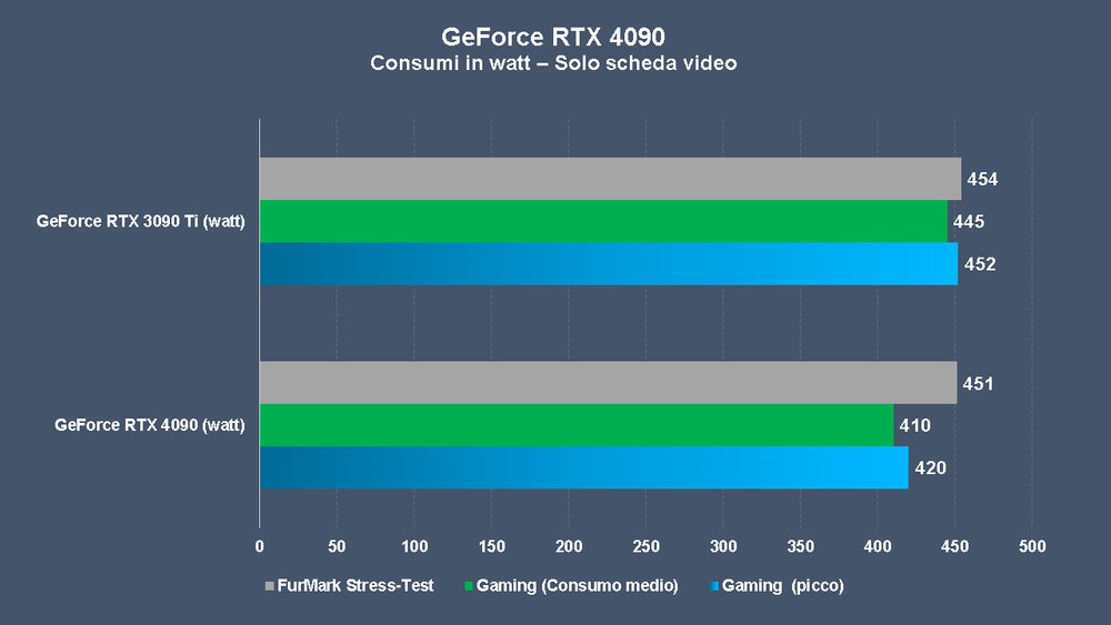 Per il resto i grafici parlano da soli, confermando i dati del produttore e gettando le basi per un nuovo punto di partenza per i competitor e le GPU next-gen, AMD in primis. Un accenno anche al potenziale in overclock di questa GPU che, seppur richiedendo molto alla PSU, risulta stabile nel quotidiano settata sino a 3 GHz e non solo per una sessione di benchmark; certo che 600 watt sono tanti, ma come visto nelle varie sessioni non c’è tutta questa necessità di “pompare” ulteriormente le frequenze della GeForce RTX 4090 (che supera comunque i 2,7 GHz). A questo proposito, negli articoli futuri cercheremo di trovare lo spazio per ulteriori prove in overclock, individuando i limiti in frequenza sia con TDP di fabbrica (450W) sia sbloccando tale valore via software (oltre i 600 watt). NVIDIA GeForce RTX 4090 promossa a pieni voti quindi, in attesa dei modelli “più consumer” come la GeForce RTX 4080 e delle sfidanti Radeon RX 7000 basate su architettura RDNA3.