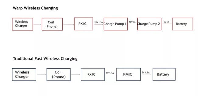 Nell’immagine sopra è spiegata brevemente la tecnologia di ricarica che si avvale di un potenziale di 20 Volt in uscita ad 1,5 Ampere: all’interno dello smartphone sono presenti due pompe di carica che abbassano il potenziale a 5V e 6 Ampere per l’ingresso nella batteria. Ovviamente tutto ciò genera molto calore motivo per il quale, sulla doc, è stata integrata una ventolina che scarica aria direttamente sulla cover posteriore di OnePlus 8 Pro attraverso una feritoia sopraelevata che, a sua volta, fa in modo che lo smartphone non sia direttamente a contatto con la dock ma rimanga distanziato di un paio di mm.