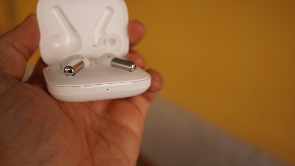 Aprendo il case abbiamo l’alloggiamento delle due auricolari e il tasto per il pairing. Sulla parte frontale troviamo invece il LED di stato che indica il livello di carica e lo stato delle cuffie. Buone infine le dimensioni: 60,1 mm x 49 mm x 24,9 mm (52 grammi il peso), sufficienti per alloggiare comodamente la custodia nella maggior parte delle tasche.