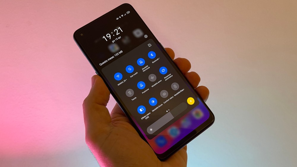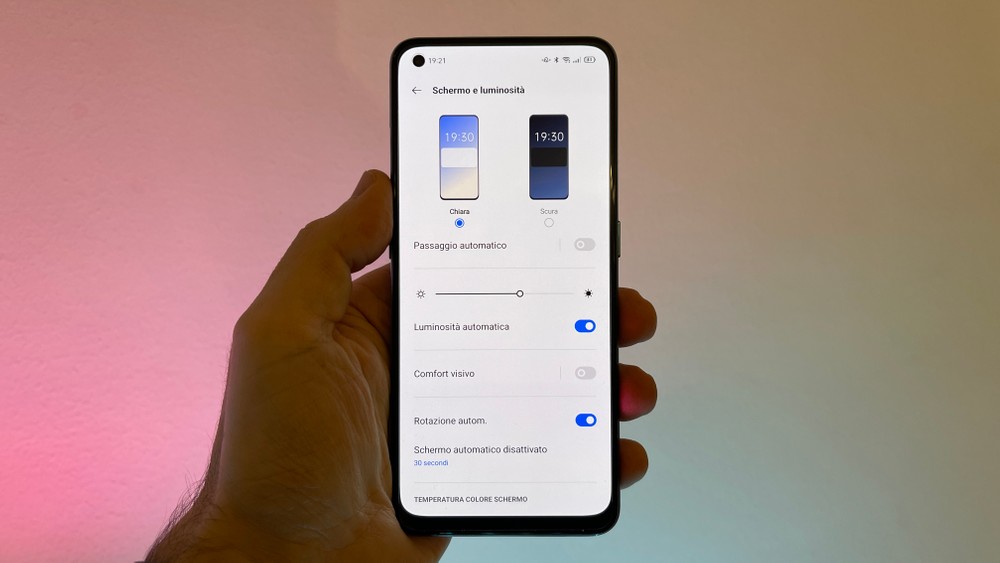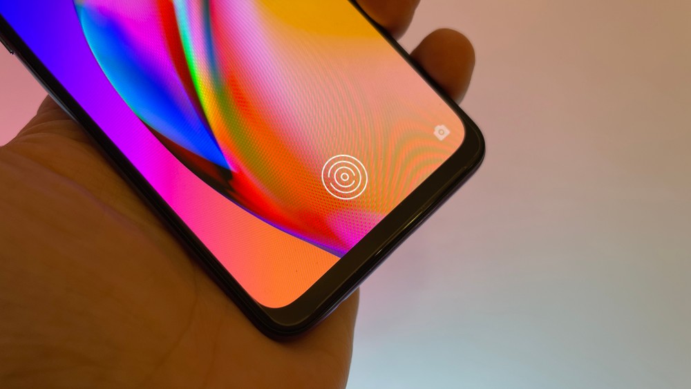 Il display è bello luminoso, lo si nota subito appena si preme il tasto di accensione per iniziare la prima configurazione. La cornice è abbastanza sottile tranne nella parte bassa dove resta un po’ più spessa mentre sulla parte alta c’è un foro che ospita la fotocamera da 16MP. Nel display è integrato anche il sensore biometrico per il riconoscimento delle impronte, sempre molto rapido ma non sempre preciso al primo colpo.