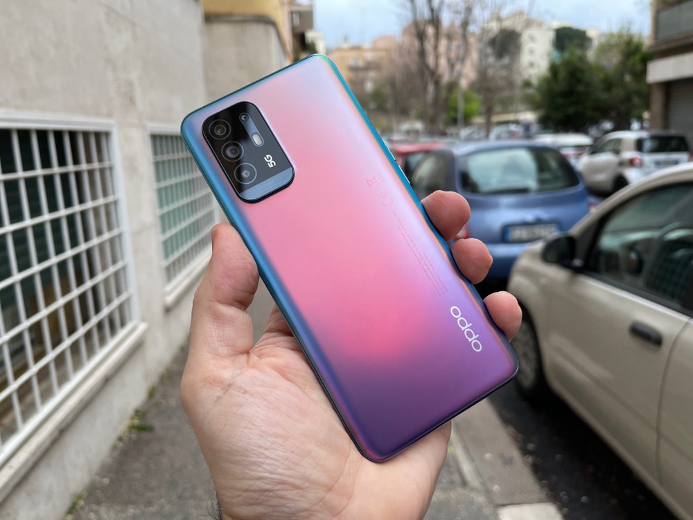 Sul retro c’è anche un importante gruppo ottico, un po’ sporgente ma protetto da un vetro Gorilla Glass 5, con quattro fotocamere il flash LED ed una scritta 5G che si fa subito notare. Il logo OPPO in basso è abbastanza discreto. Lateralmente ci sono i tasti per la regolazione del volume, il tasto di accensione, la porta Type-C con jack audio e speaker sulla parte inferiore e solo un microfono su quella superiore.
