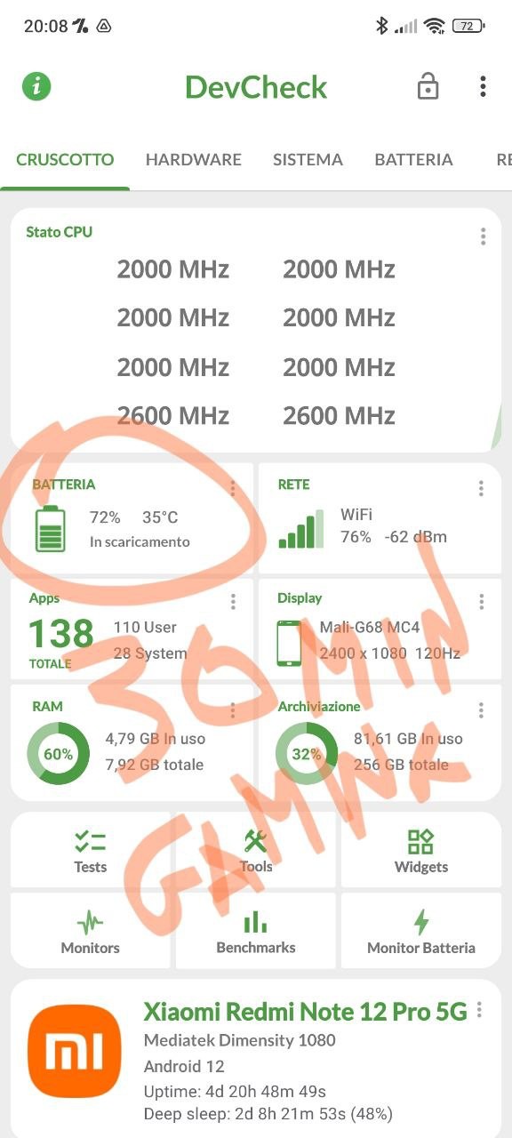 Se la MIUI 14 è pressochè la stessa degli altri modelli già recensiti, l’hardware è un piccolo cambiamento rispetto al precedente Redmi Note 11 Pro+ con il passaggio al Mediatek Dimensity 1080 accompagnato da 8GB di ram LPDDR4x 16Bit dual-channel e 256GB di storage UFS 2.2. Al prezzo di listino, 500€, mi sarei lamentato delle memorie UFS 3 che si trovano negli ex top di gamma che ormai navigano sullo stesso prezzo, a 350€ invece non posso lamentarmi essendo in linea con i competitor. Non avevo mai provato questo MTK 1080 e per quanto fossi partito scettico mi ha sorpreso: stabilissimo nell’uso social, animazioni mai tagliate o freezate, utilizzo gaming soddisfacente e temperature sempre sotto controllo.