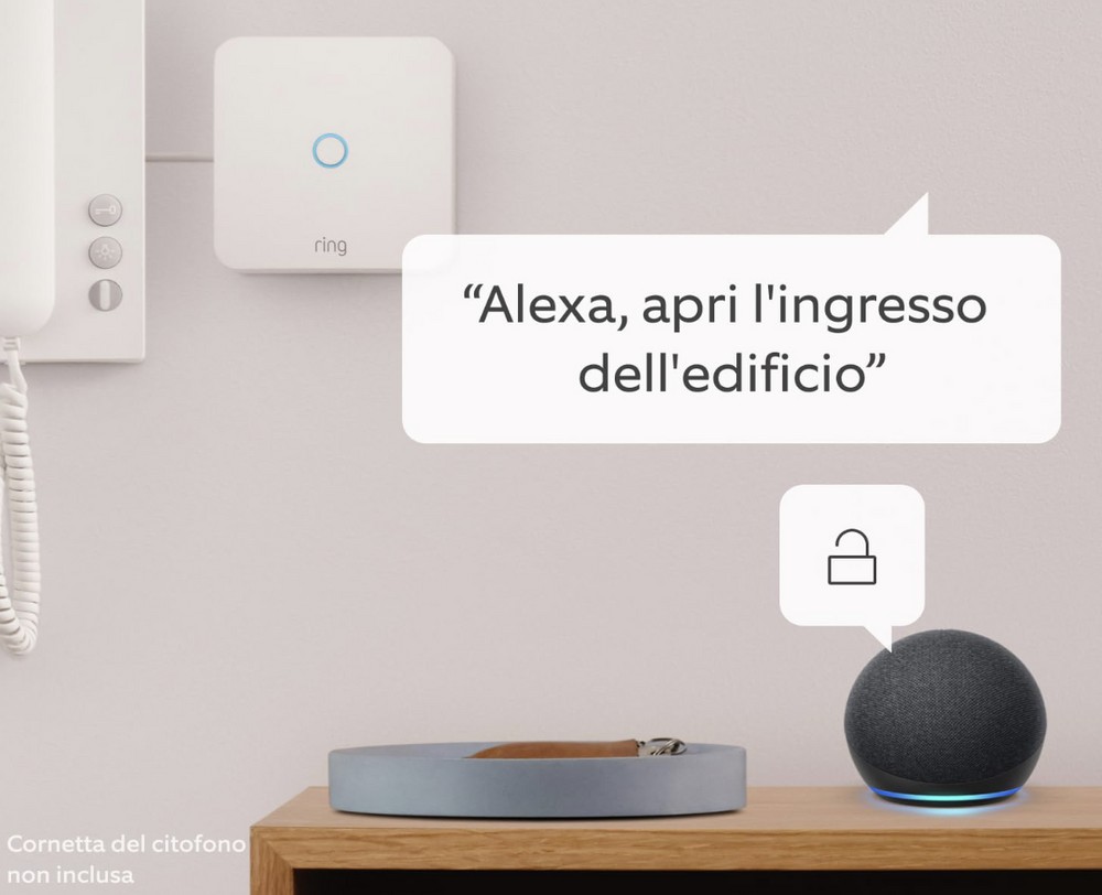 Un ulteriore vantaggio dato dalla connessione Alexa è la possibilità di utilizzare gli Echo come cicalini ulteriori. In pratica quando suoneranno il campanello, oltre al Ring Intercom e al vostro citofono, suonerà anche l’Echo nella stanza in cui è posizionato. Se quindi avete una casa grande o stanze lontane dal citofono, sentirete sempre il campanello e… potrete rispondere senza alzarvi e anche tirare la corda.