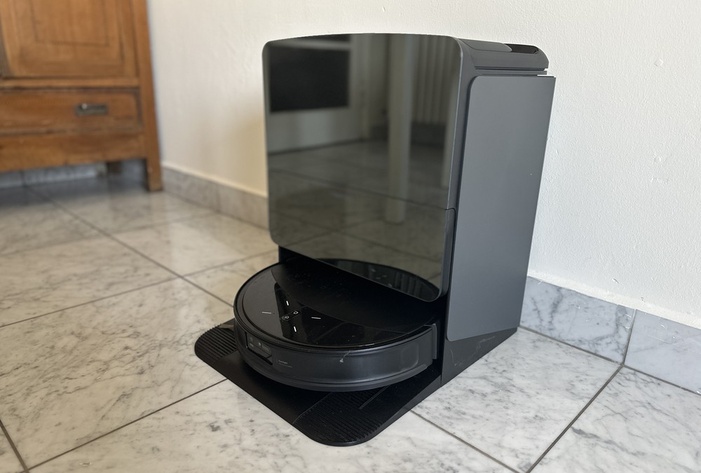 L’impatto estetico è molto positivo, elegante, con una superficie anteriore a finitura specchiata e la sensazione di avere un piccolo fuoriclasse delle pulizie in casa. La stazione rimuove automaticamente i panni se selezionate la modalità “solo aspirazione” o prima di affrontare i tappeti a pelo lungo, ricarica il robot lontano dagli orari di punta in poco più di due ore e mezzo, lava i panni e anche sé stessa con acqua calda a 80°C e rileva quanto sono sporchi per valutare se rilavarli; poi li asciuga con aria calda a 55°C, oltre a svuotare automaticamente la polvere dal robot.
