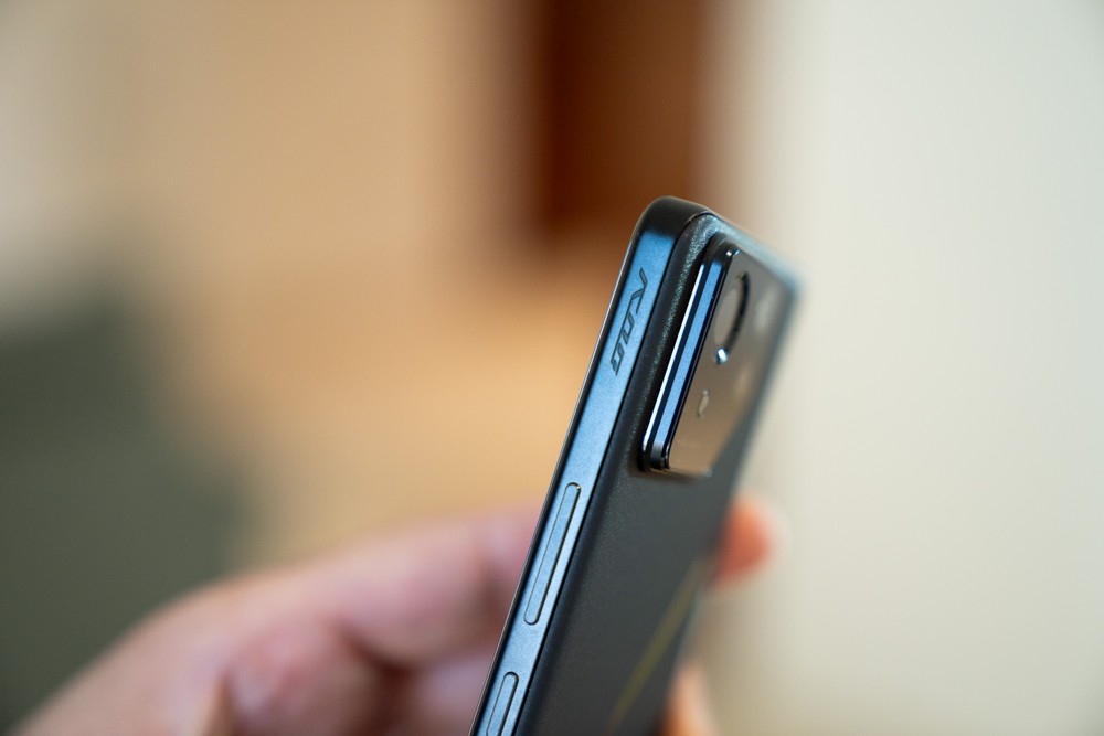 La finitura nera opaca posteriore è veramente piacevole, bella da toccare e un peccato coprirla con la cover – in dotazione – o con altre coperture che potete acquistare. Bella anche la continuità con la colorazione opaca della scocca laterale che rende lo smartphone veramente elegante e, secondo me, il Rog più bello ad oggi realizzato.