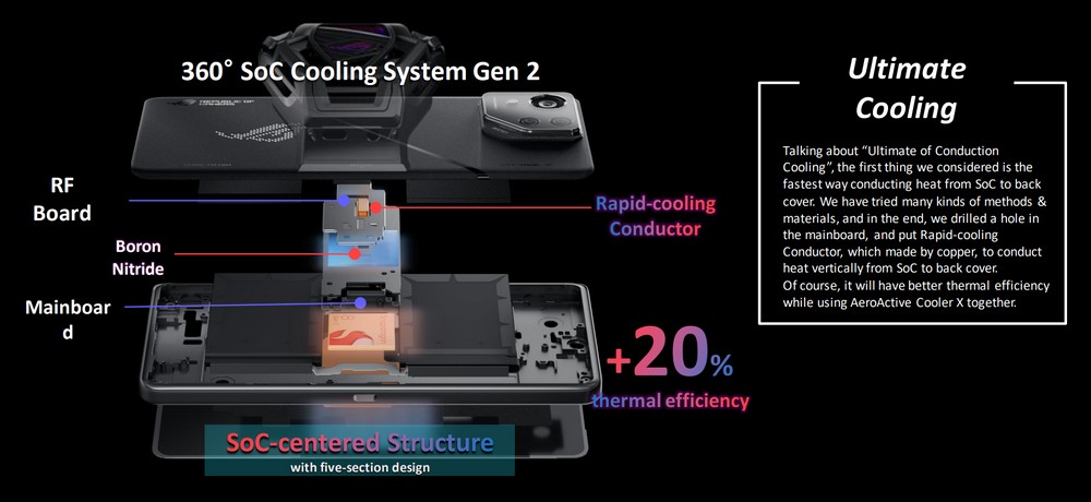 Questo lo si nota in tutte le condizioni, sia in utilizzo gaming pesante, sia in utilizzo classico, sia in standby. Il punto cruciale è però un altro: Asus riesce a tenere a bada questa CPU grazie ad un sistema di dissipazione interno enorme e ad un posizionamento centrale della CPU rispetto alla scocca che permette di raffreddare ancora meglio il cuore dello smartphone.