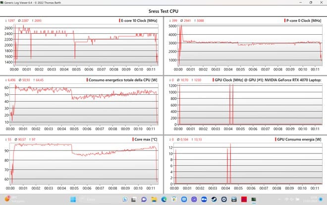 Bene, ma come si comporta questo hardware quando messo sotto torchio? Direi che non possiamo lamentarci. Il nostro stress test, che porta tutti i core della CPU al massimo carico per oltre 10 min, mostra infatti un andamento buono, con gli E-core che si stabilizzano ad una frequenza media di circa 2,3 GHz, che diventano quasi 3 GHz per i P-core. Tutto ciò con temperature medie che sfiorano i 90 gradi e un consumo di circa 50W.