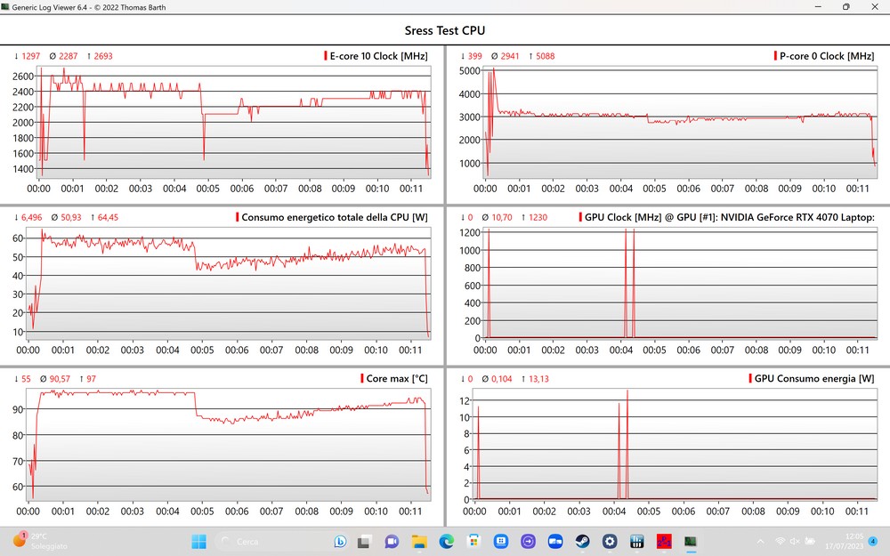 Bene, ma come si comporta questo hardware quando messo sotto torchio? Direi che non possiamo lamentarci. Il nostro stress test, che porta tutti i core della CPU al massimo carico per oltre 10 min, mostra infatti un andamento buono, con gli E-core che si stabilizzano ad una frequenza media di circa 2,3 GHz, che diventano quasi 3 GHz per i P-core. Tutto ciò con temperature medie che sfiorano i 90 gradi e un consumo di circa 50W.