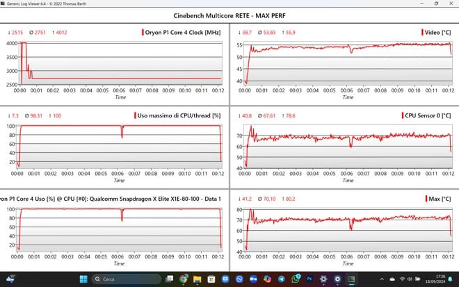 Il boost di 4 GHz permette al portatile di ottenere punteggi più elevati nei benchmark, soprattutto in single-core, anche se non di tantissimo. Sembra piuttosto chiaro che Samsung abbia preferito favorire sottigliezza e leggerezza invece di ottimizzare al massimo le prestazioni – che è anche condivisibile, volendo, su macchine di questa classe. In concreto, su CineBench 2024 abbiamo un +13% circa rispetto al 78 in single-core, ma in multi si raggiungono più o meno gli stessi valori, se non leggermente inferiori, visti nella recensione dell’ASUS.
