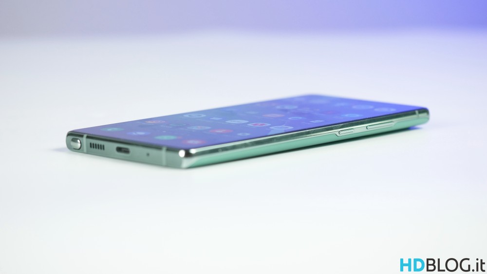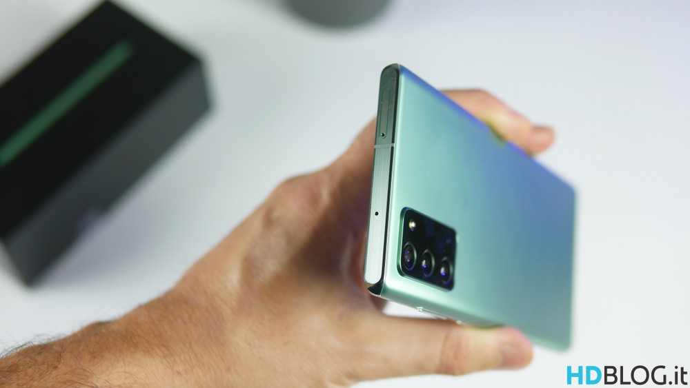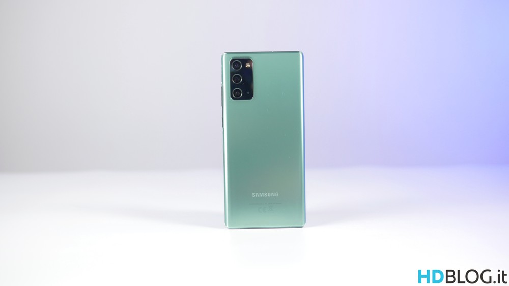 Oltre ai bordi piatti ci sono angoli arrotondati con un raggio di curvatura accentuato e cornici leggermente più spesse del modello Ultra, parlando di materiali cambia completamente la back cover che su Note 20 è in “Glasstic” (policarbonato) anziché in vetro Gorilla Glass 7, mentre il vetro frontale è un Gorilla Glass 5.