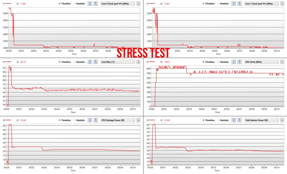 Se guardiamo ai grafici relativi allo stress test notiamo subito come dopo il picco iniziale, nel quale i core raggiungono il limite massimo di frequenza (3,9GHz), abbiamo un calo abbastanza repentino dovuto all’innalzamento delle temperature. Dopo pochi secondi si raggiungono e superano i 90 gradi su tutti i core. Il sistema a questo punto abbassa il TDP riportando le temperature sotto i 70 gradi e stabilizzandosi a circa 20W con frequenze di poco superiore a 1 GHz. Giusto per proporvi un paragone, nello stesso test, il Lenovo C940 mantiene temperature tra gli 80 e gli 85 gradi con frequenze su tutti i core mai inferiori a 1,5 GHz. In tutti e due i casi siamo ampiamente sotto la soglia di sicurezza consigliata da Intel (99°) ma con rese ben differenti in termini di prestazioni.