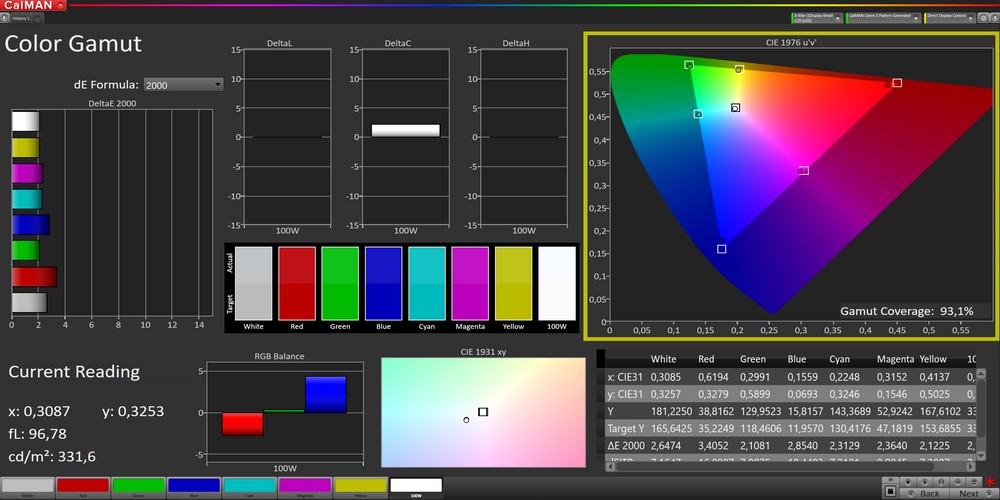 In relazione alla precisione nella riproduzione dei colori abbiamo invece misurato dei delta E ampiamente inferiori a 2 sia per la scala di grigi che per i colori. Si tratta di un valore molto basso, che si posiziona in tutti e due i casi sotto alla soglia che indica la tolleranza, ovvero 3.